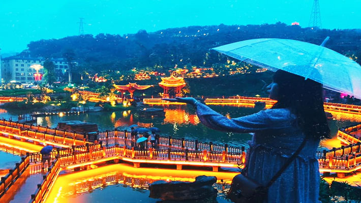 Đây chính là linh hồn của Hà Khẩu. Khi hoàng hôn buông xuống, hàng nghìn ánh đèn LED bừng sáng trên những cây cầu đá, lầu vọng cảnh và các công trình kiến trúc gỗ. Toàn bộ khu công viên hiện lên như một bức tranh thủy mặc huyền ảo. Đây là nơi bạn có thể diện những bộ sườn xám hay cổ trang để hóa thân thành nhân vật trong các bộ phim truyền hình nổi tiếng.
