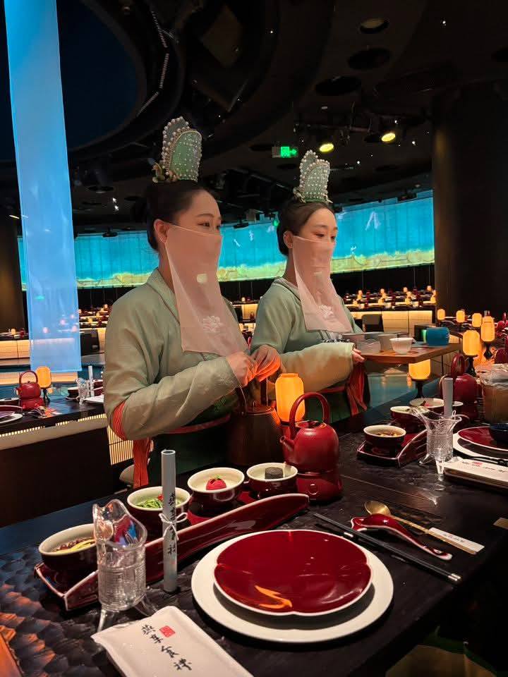 Khác với những nhà hàng sang trọng thông thường, không gian Cung Yến tại các thành phố lớn như Bắc Kinh, Thượng Hải hay Hàng Châu được phục dựng chuẩn xác theo tỷ lệ và phong cách kiến trúc hoàng gia. Từ những bức rèm voan mỏng manh che hờ, thảm trải nền họa tiết "vân lộc" đến những chiếc bàn gỗ chạm khắc tỉ mỉ, tất cả đều toát lên vẻ quyền quý, xa hoa.