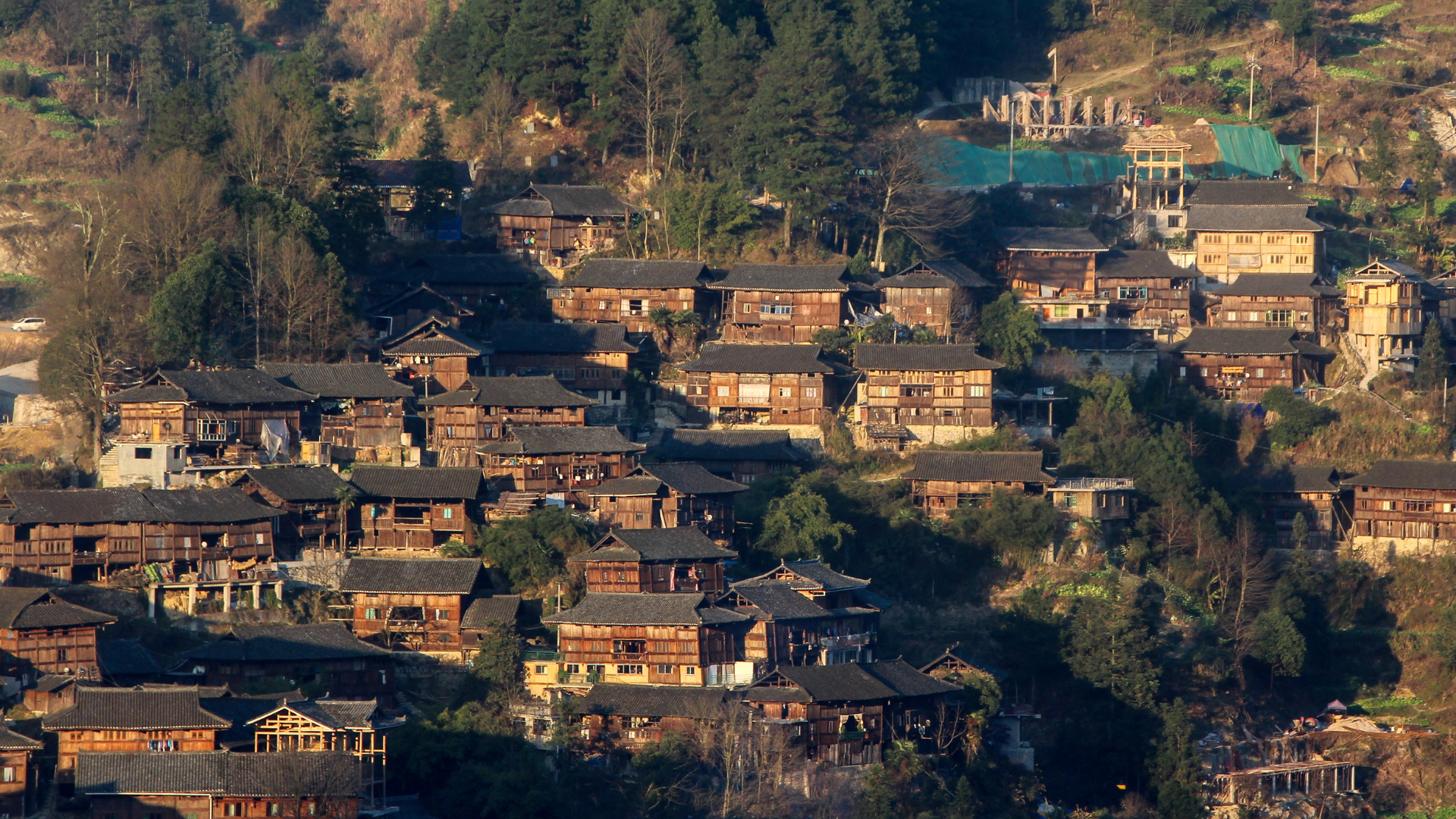 Những ngôi nhà san sát nhau bên sườn núi tại Thiên Hộ Miêu Trại (ảnh sưu tầm)
