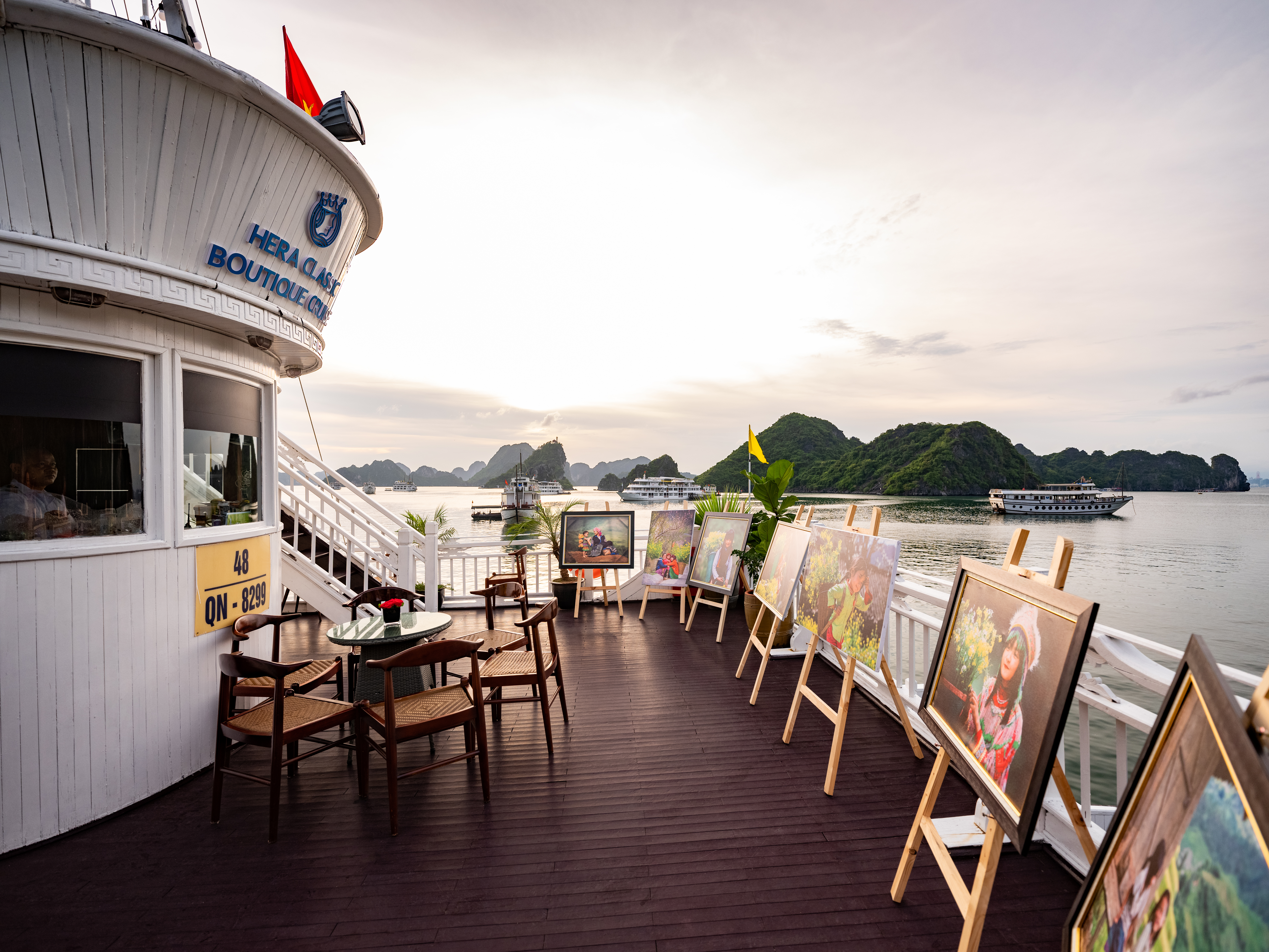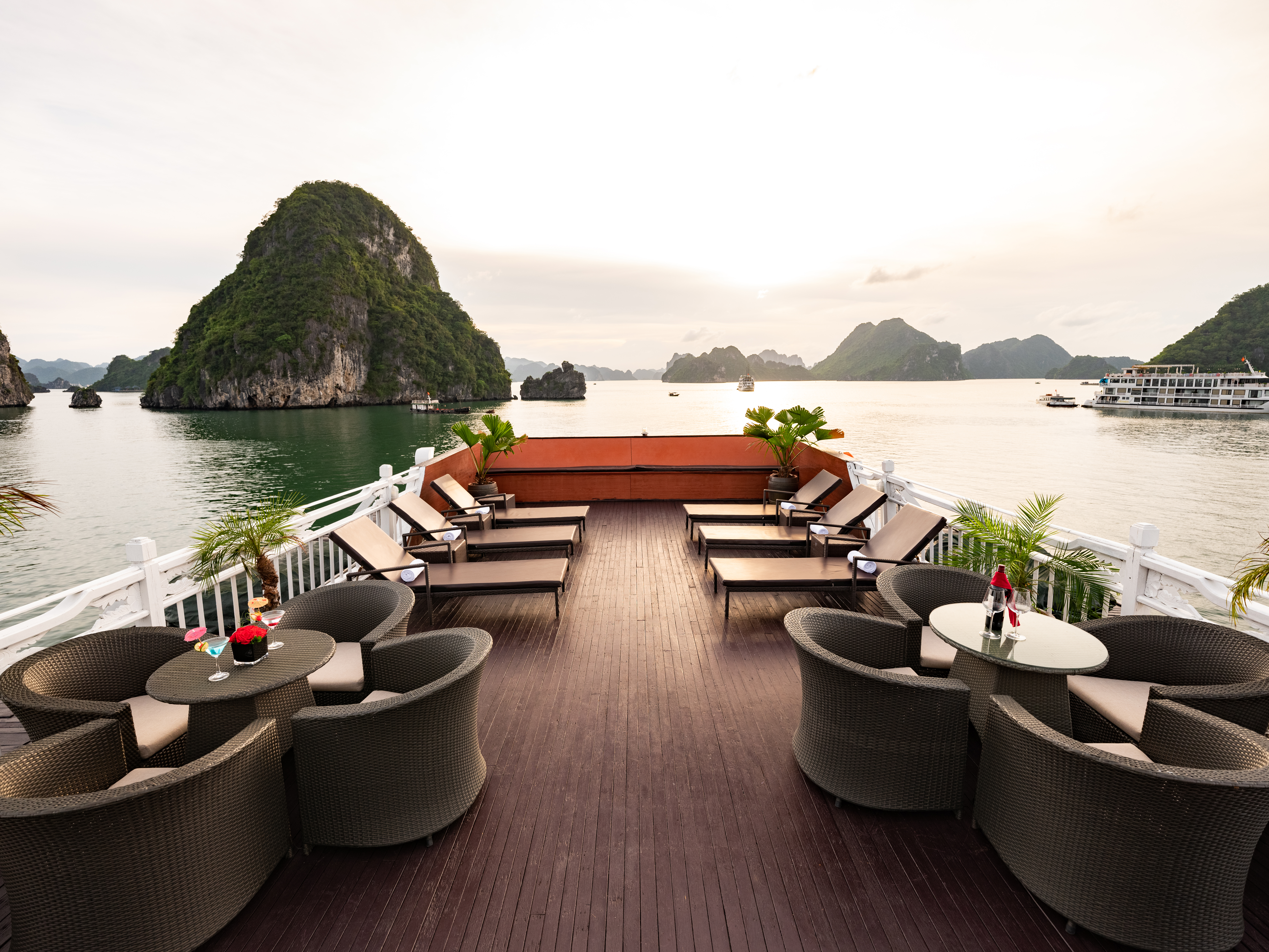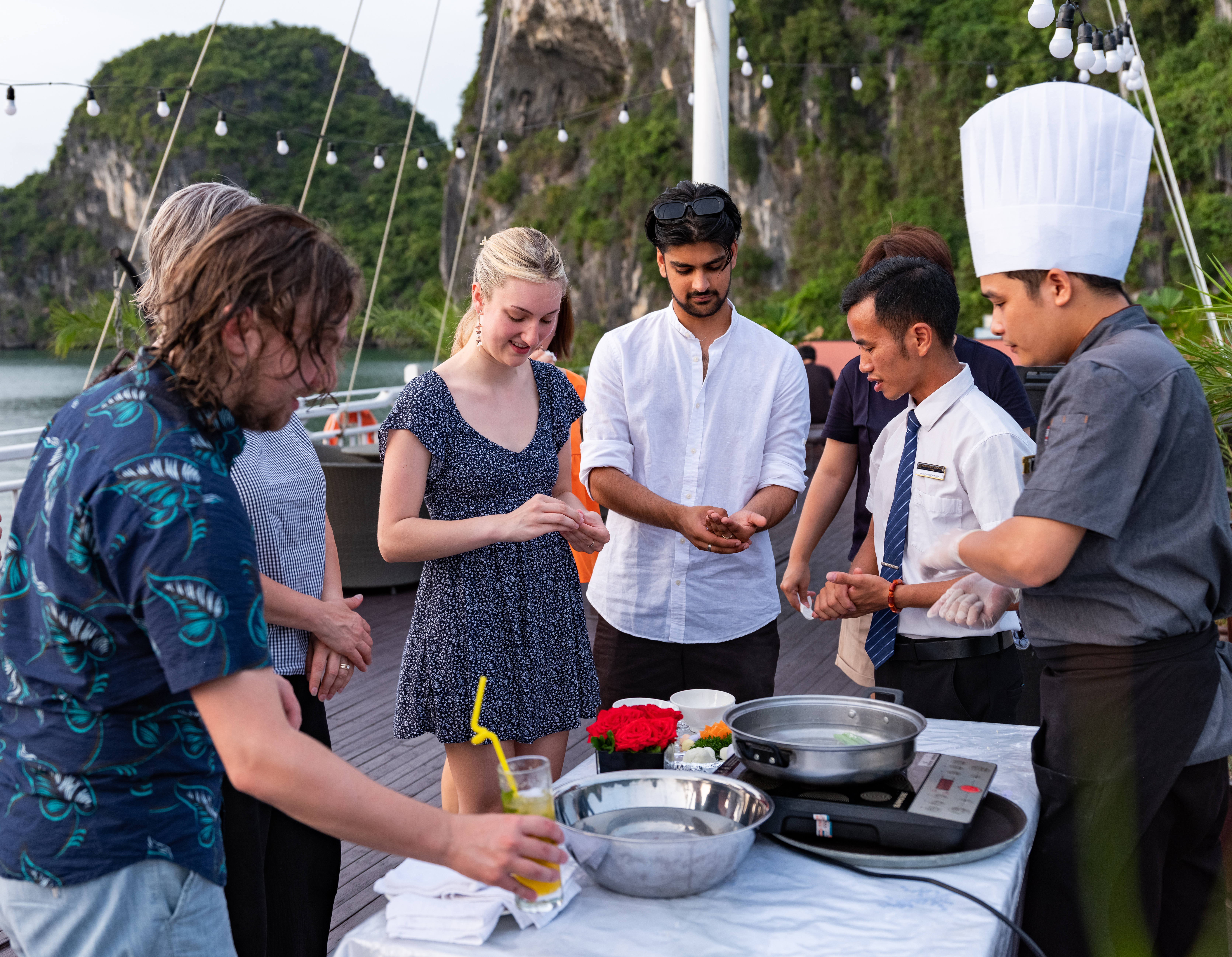 17.30-18.00 Trở lại tàu, quý khách sẽ tham gia sunset party & lớp học nấu ăn trong khi tàu đi về phía bờ. Quý khách có thể tận hưởng những giây phút thư giãn trong khi nhâm nhi một tách trà hoặc cà phê truyền thống của Việt Nam trên boong tắm nắng giữa khung cảnh tuyệt vời và hoàng hôn tuyệt đẹp. Vịnh Hạ Long yên tĩnh vào ban ngày, nhưng khi mặt trời lặn, Vịnh càng trở nên yên tĩnh và yên bình hơn.