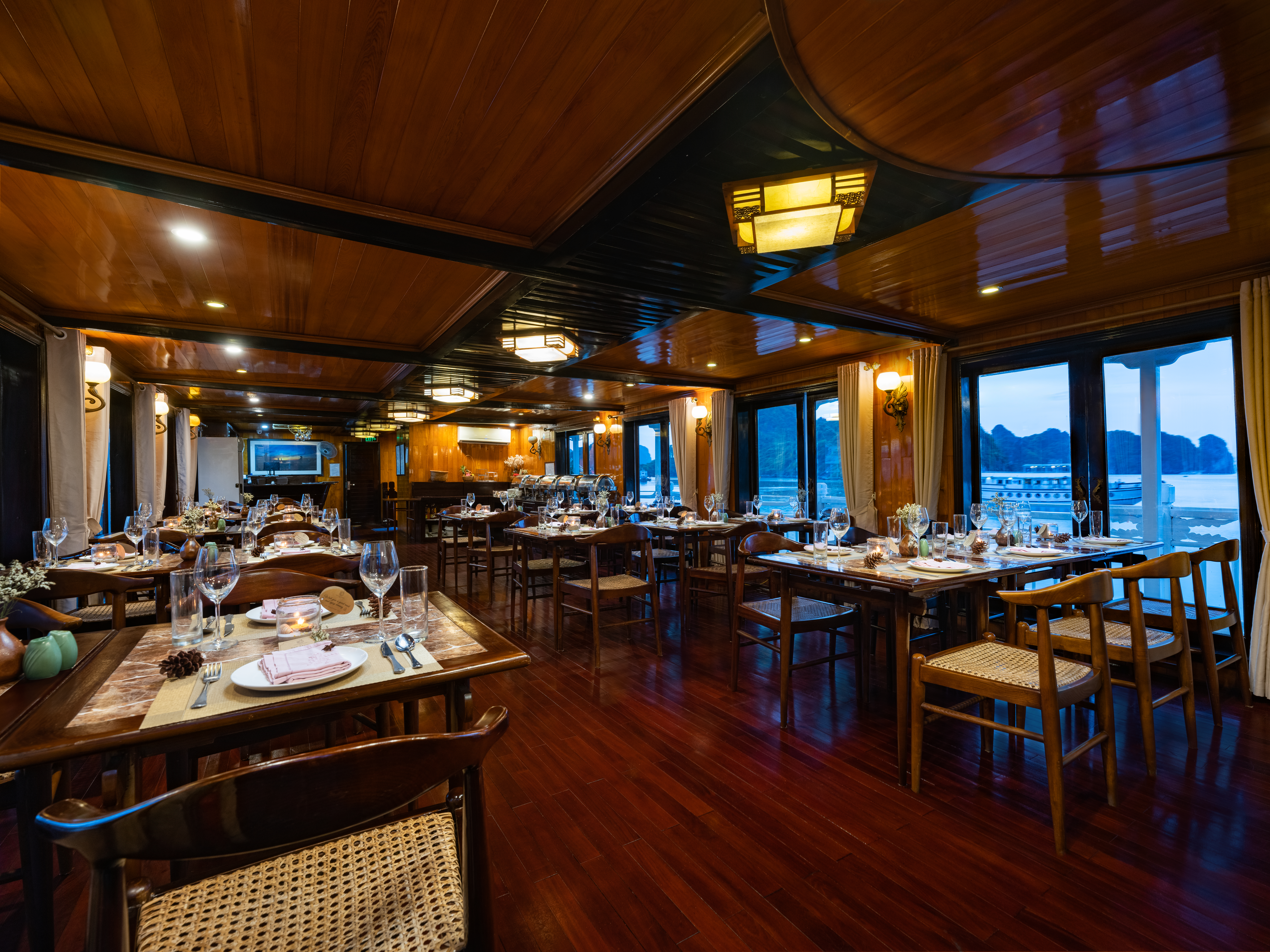 Thưởng thức bữa trưa tại nhà hàng sang trọng trên tàu trong khi tàu đi về phía Hang Sửng Sốt và đảo Titop.